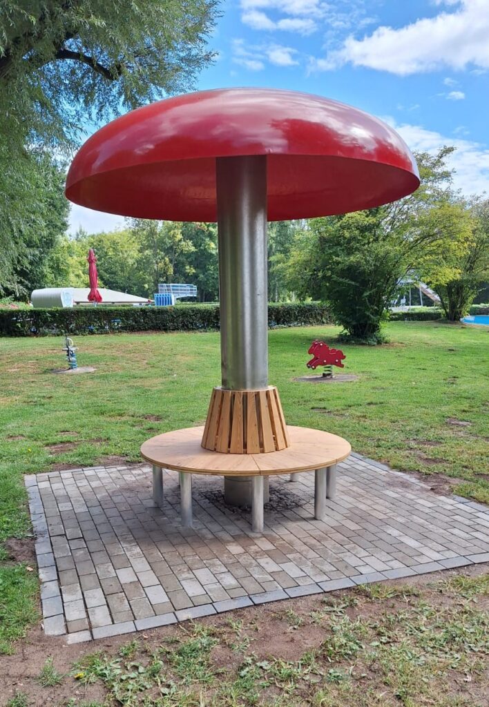 Damit ist der Pilz nicht nur ein Stück Erinnerung, sondern auch ein neuer Treffpunkt geworden. Schon bald wird außerdem das lang ersehnte Klettergerüst aufgestellt. Zwar geschieht dies außerhalb der Badesaison, doch soll das Freibad dafür noch einmal geöffnet werden – ein Herbsttag zum Klettern, Spielen und Begegnen.