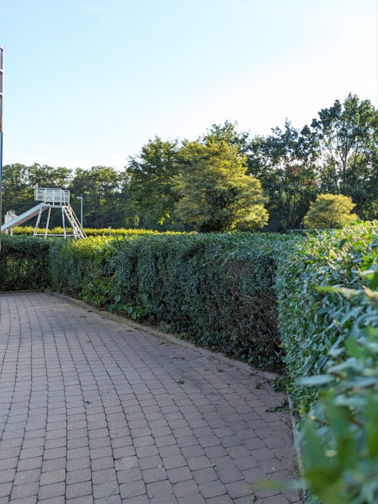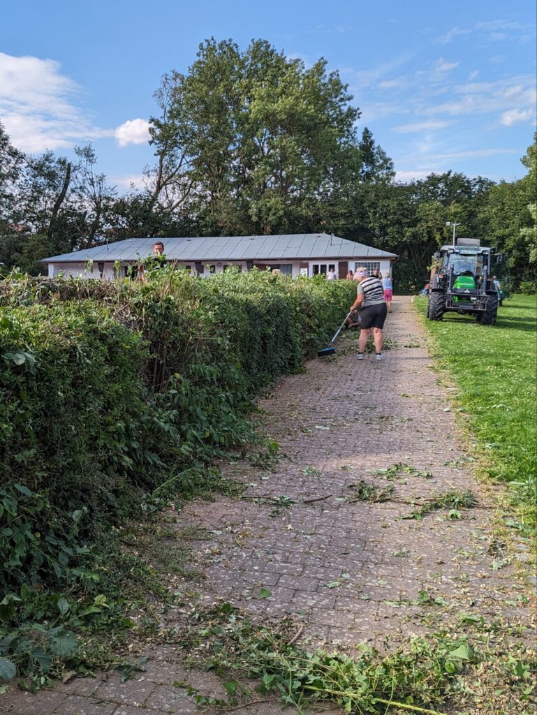 Am Freitagnachmittag um 14:00 Uhr ging es in Begleitung eines städtischen Mitarbeitenden los. Gartengeräte und anderes Arbeitsgerät brachten die anwesenden Freunde von zu Hause mit. Der Heckenschnitt war dringend notwendig. Die in der langen Zeit sehr stark gewachsenen Hecken wurden in einem ersten groben Schnitt stark gekürzt. Am Samstag ab 9:00 Uhr folgte dann der Feinschliff an den Hecken.