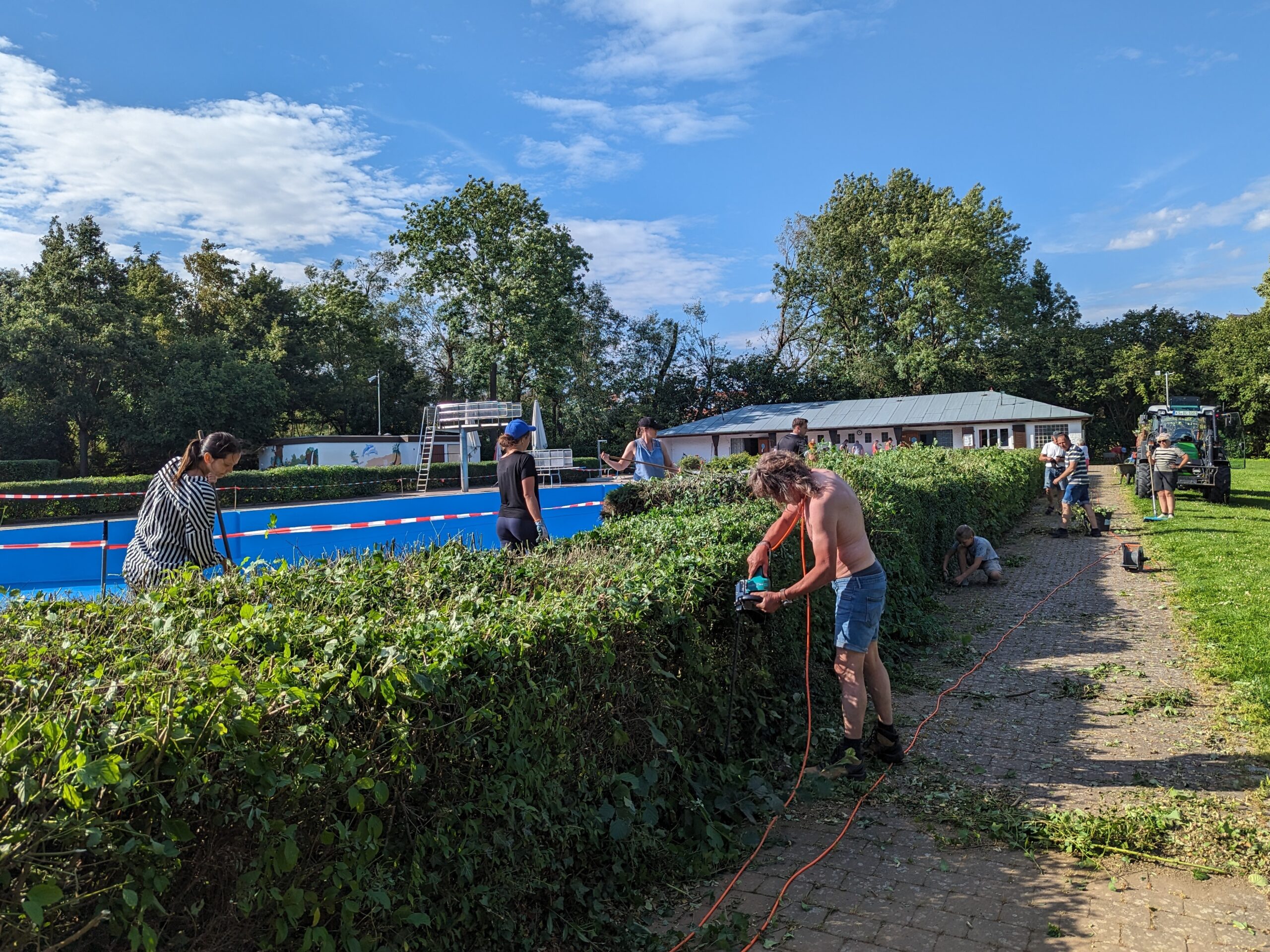 Durch die Helfenden wurden an beiden Tagen insgesamt rund 220 laufende Meter Hecke geschnitten, die das Schwimmbecken und die beiden Planschbecken umrahmen. Das war eine tolle Leistung! Dieser erste echte Arbeitseinsatz war aber nicht nur im Ergebnis erfolgreich. Es hat allen Beteiligten auch sichtlich Spaß bereitet, gemeinsam für das Freibad anzupacken und die baldige Eröffnung zu unterstützen.