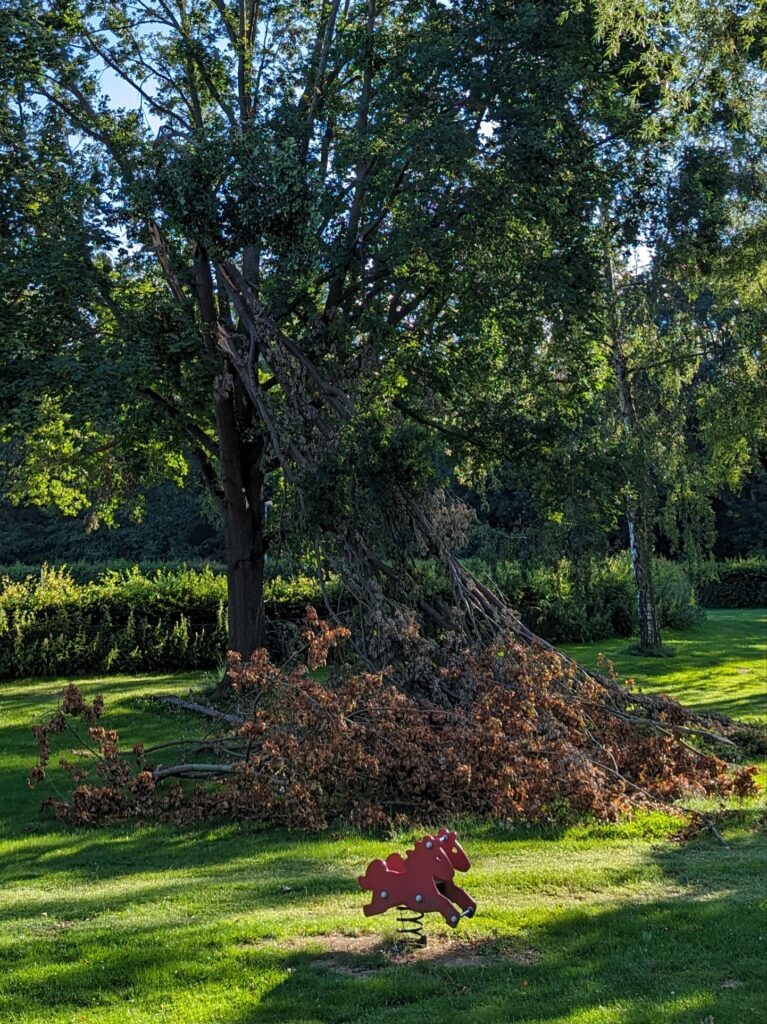 Andere Bereiche der Grünanlage sind aufgrund der noch zu begutachtenden Unwetterschäden und der Gefahr durch herabfallende Äste bisher aus Sicherheitsgründen nicht zu betreten.