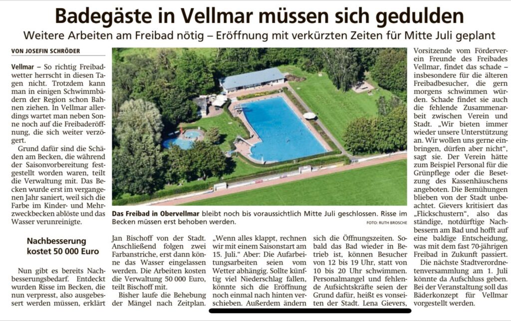 Es gibt gute Neuigkeiten! Wie bereits in der HNA am Samstag berichtet wurde, öffnet unser Vellmarer Freibad am Montag, den 15.07.24 mit verkürzten Öffnungszeiten: Montag – Sonntag von 12:00 Uhr – 19:00 Uhr.